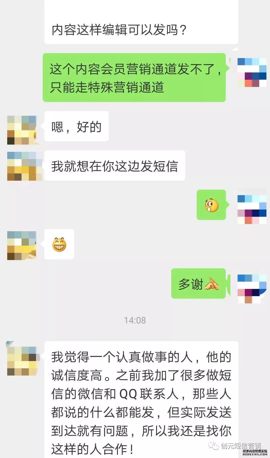 先前短信群發軟件客服,遇到過一個客戶,問短信內容能不能發,客服如實告知客戶能走什么類型的通道,不同類型的通道價格不同??头c客戶之間的聊天都是坦誠相告。