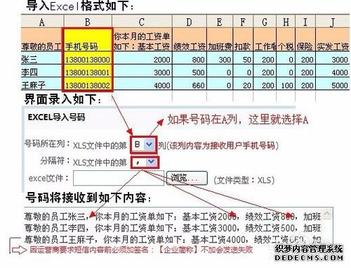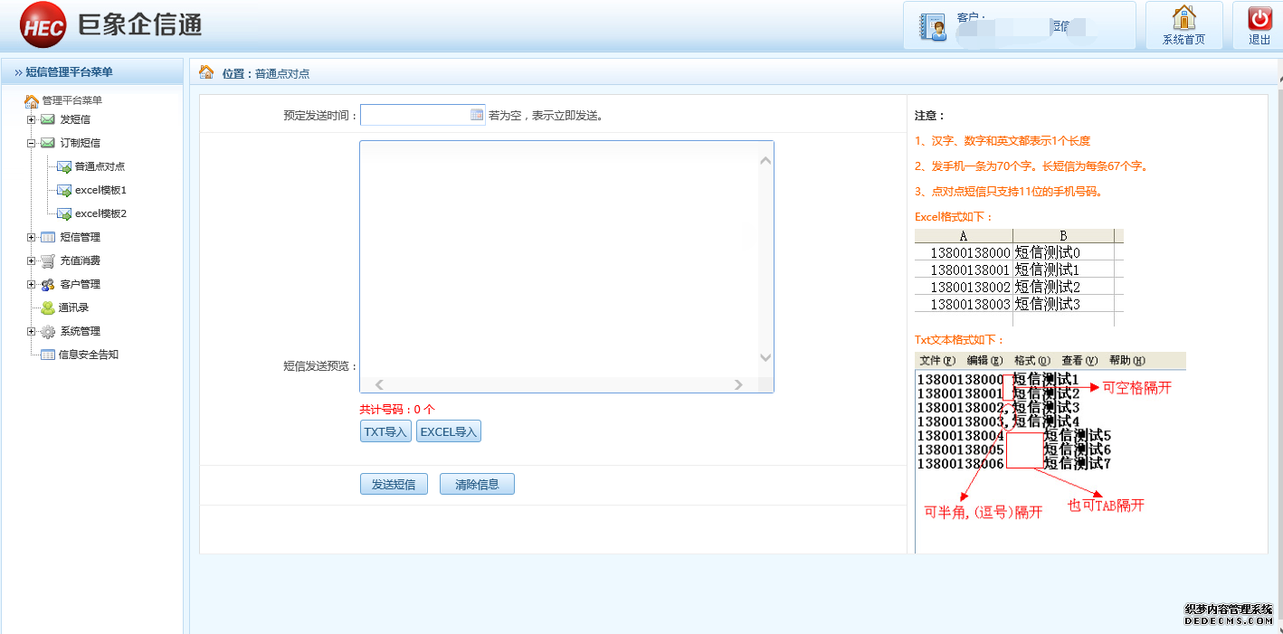 根據(jù)該頁面左邊的操作進行發(fā)送短信,這里說的主要是是發(fā)送短信的時候格式的問題。選擇好導入發(fā)送,TXT或者EXCEl導入方式,然后點擊發(fā)送短信即可,根據(jù)提示操作。